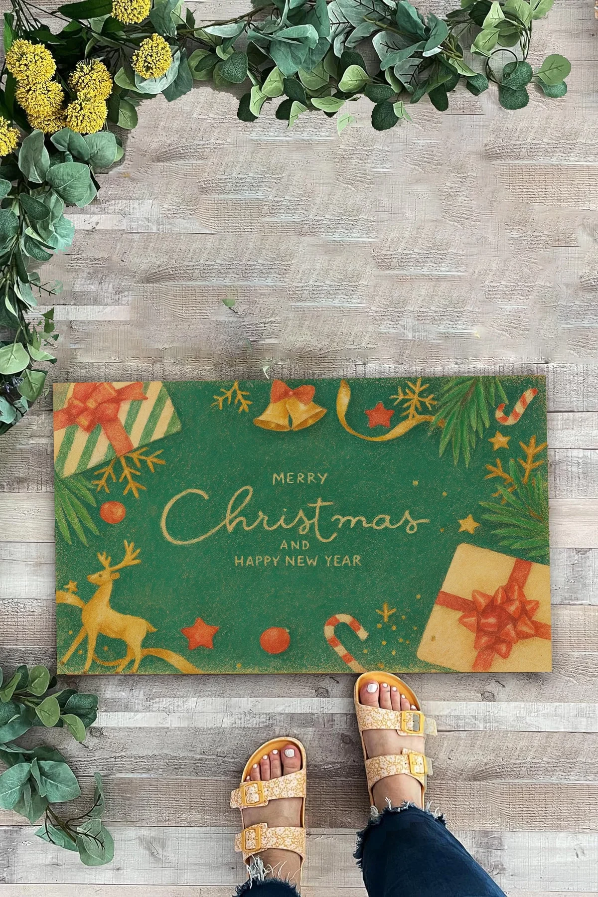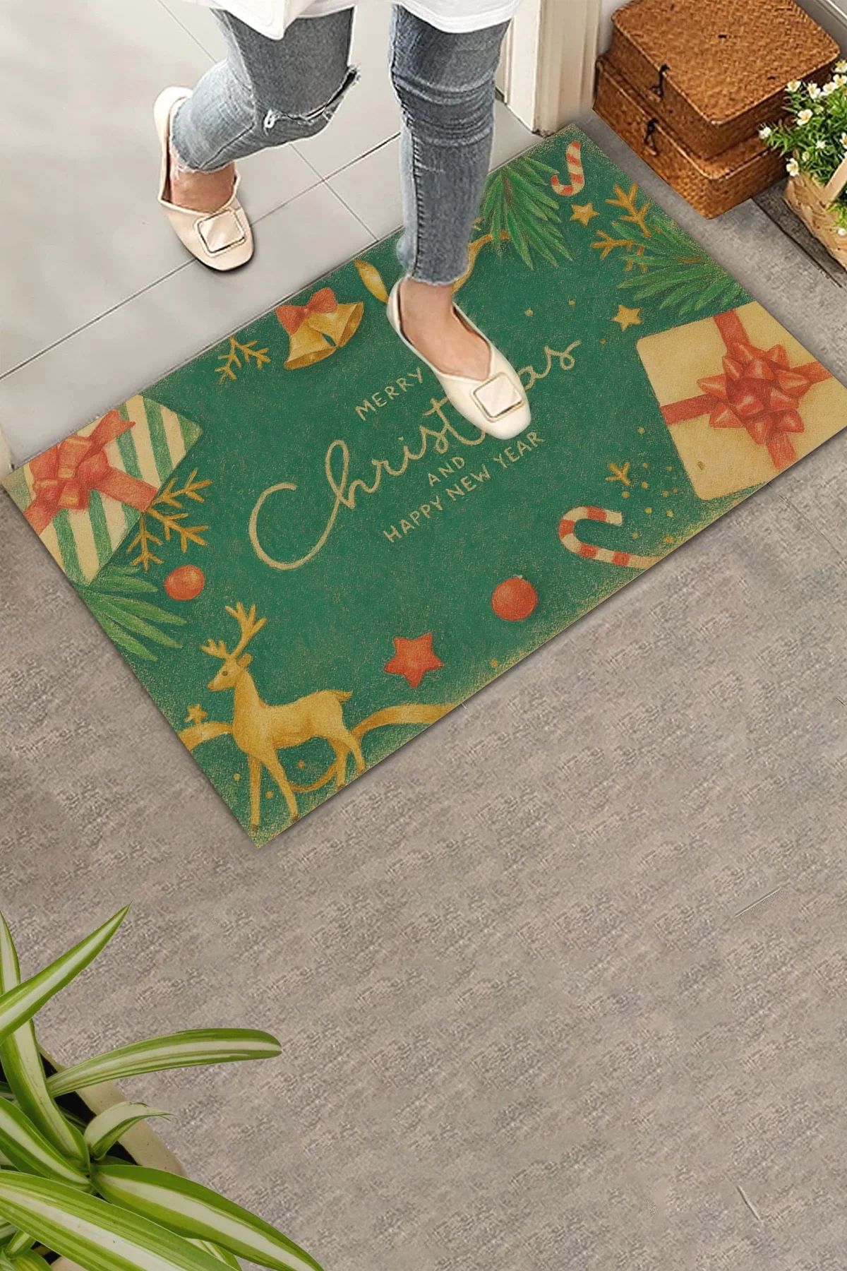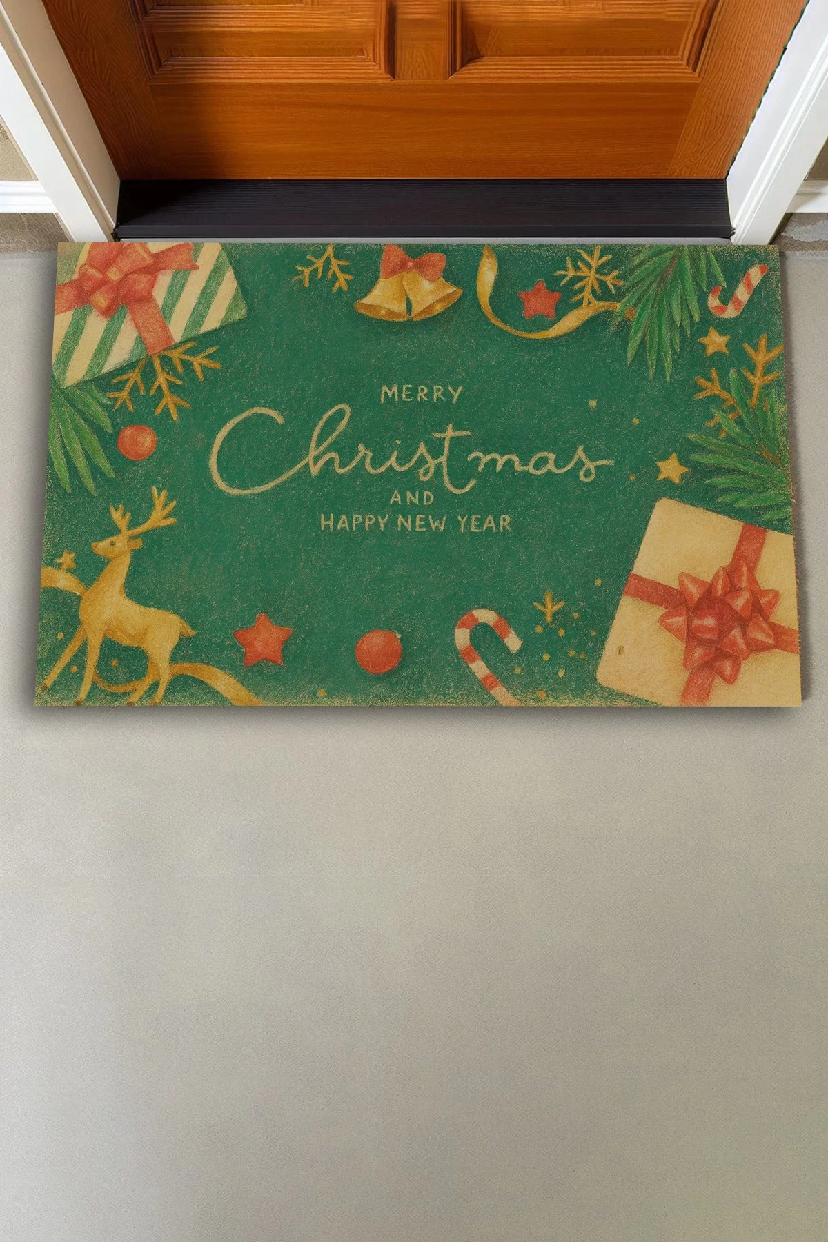 Valerine Life Happy New Year Yeşil Pastel Ren Geyikli Welcome Hoş Geldiniz Kapı Önü Paspası 45x70cm