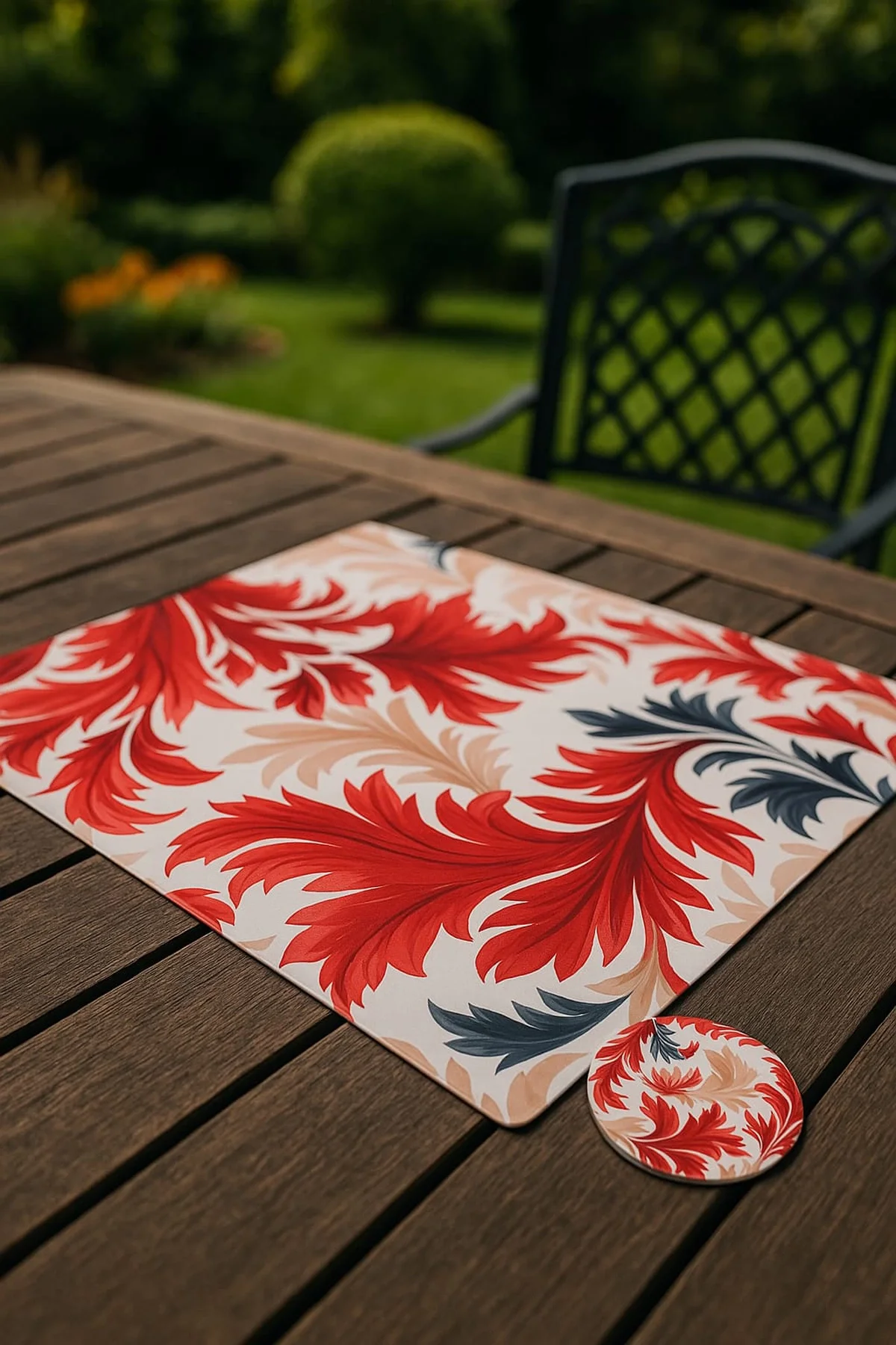 Valerine Life Kırmızı Yaprak Desenli Amerikan Deri Kaymaz Yıkanabilir Servis Altlığı 12 Parça 6 Kişilik