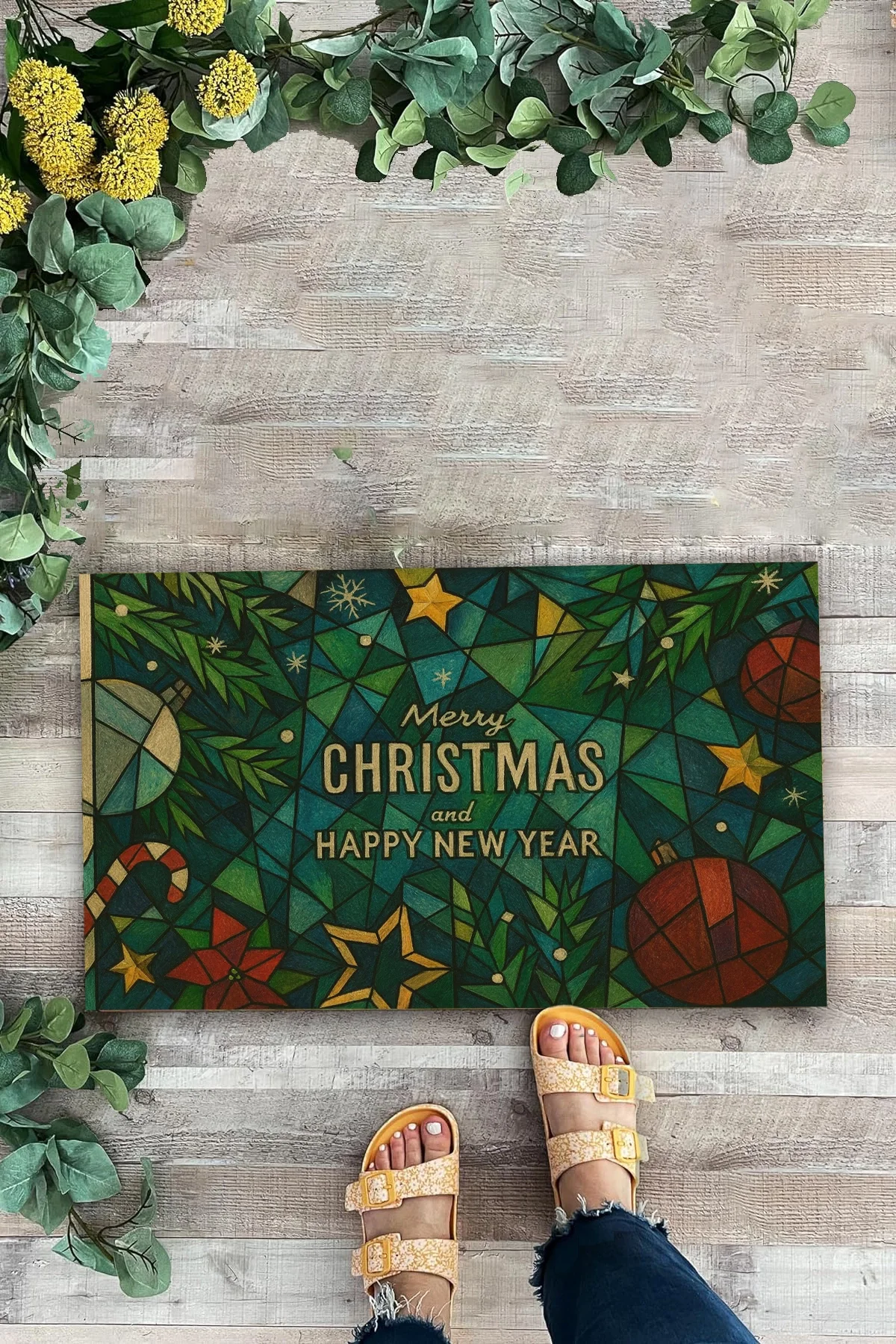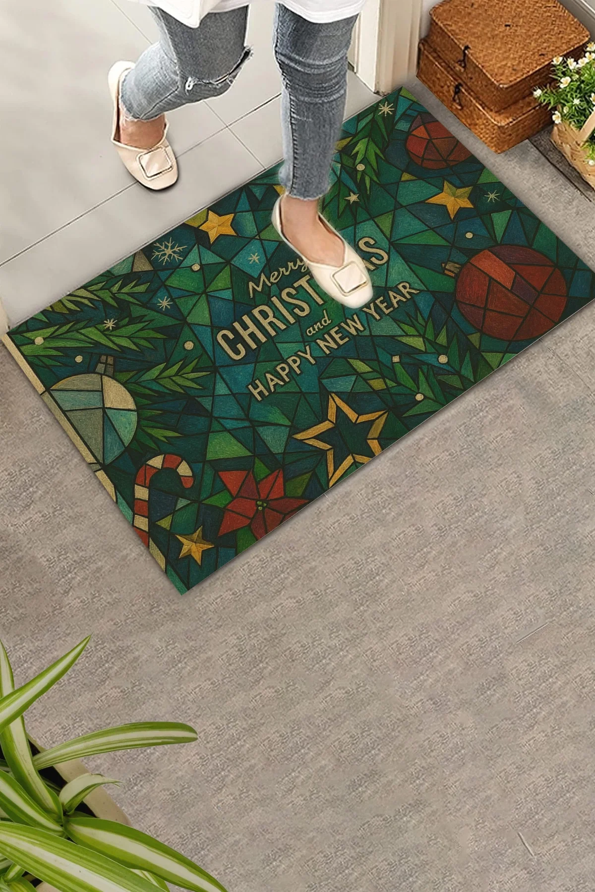 Valerine Life Picasso Tarzı Geometrik Yeşil Yılbaşı Welcome Hoş Geldiniz Kapı Önü Paspası 45x70cm