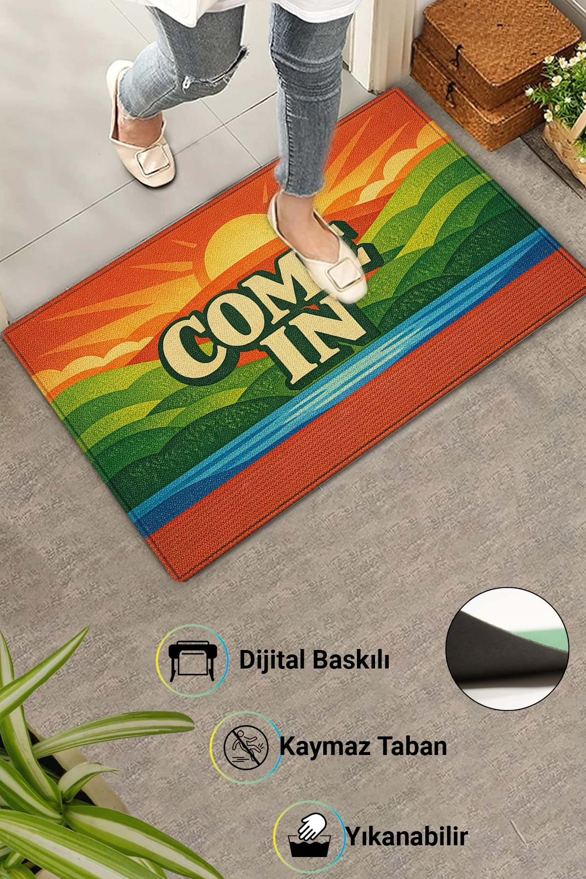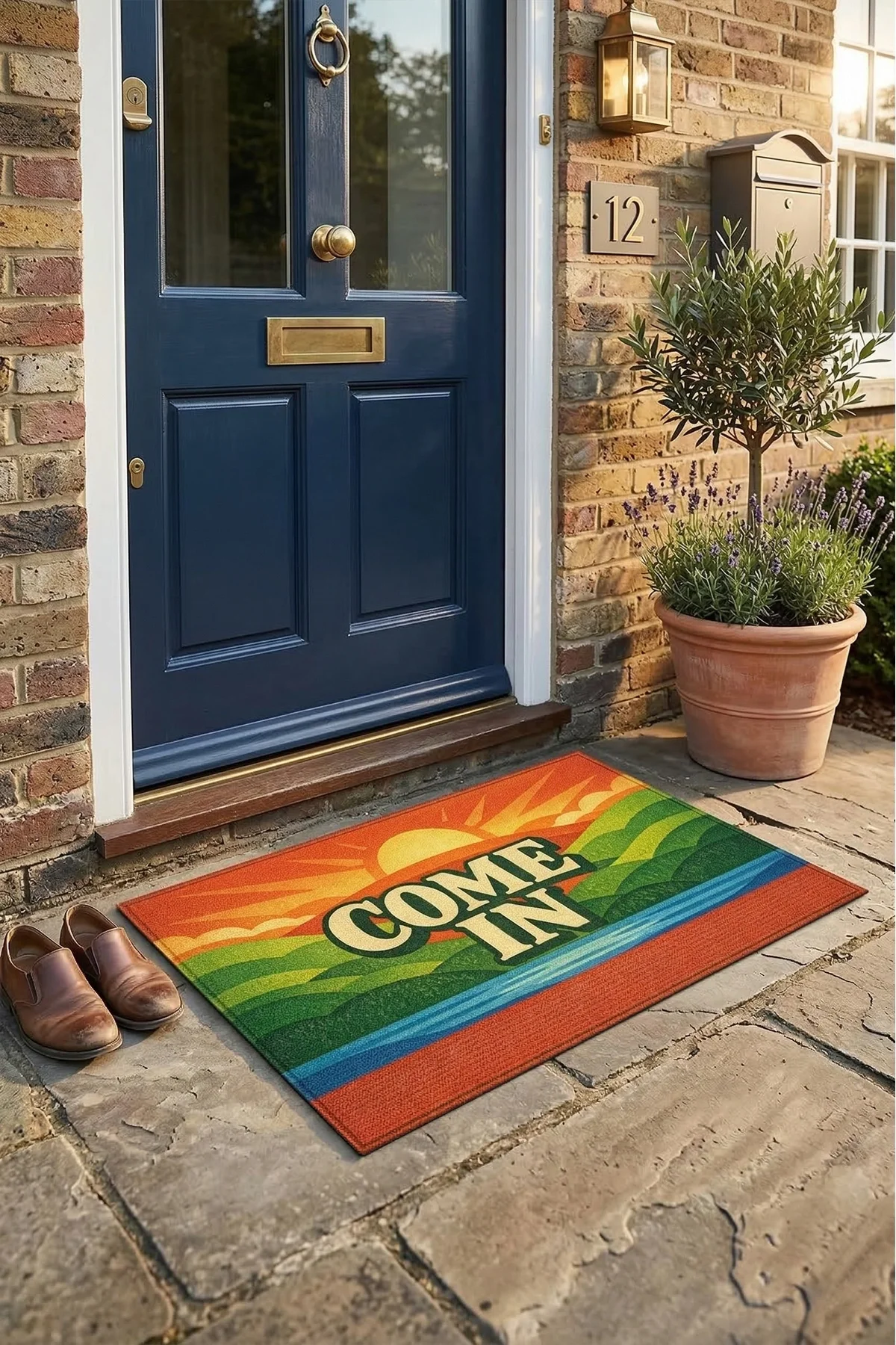 Giriş alanınıza sıcak, davetkâr bir hava katın. Retro 70’ler ilhamlı “STAY AWHILE” tipografisi; yanık turuncu gün batımı, ufka yakın soyut güneş ve katmanlı tepelerle birleşerek kapı önünde güçlü bir ilk izlenim oluşturur. Dijital baskı tekniğiyle üretilen canlı ve net detaylar, yazının uzaktan bile kolay okunmasını sağlar.